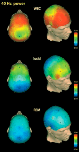 Heute weiß man dank MRT-Studien, dass im Klartraum Teile des präfrontalen Kortexes zugeschaltet werden, gleichsam einer Kamera, die das Geschehen filmt (siehe Bild).