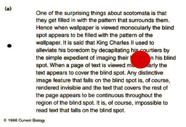 Si en esta zona no recibimos información visual, ¿cómo es que tenemos la percepción de verlo todo completo? Este fenómeno se corrige por dos vías. Por un lado, si miramos con un solo ojo nuestro cerebro “rellena” esos huecos de información por el estímulo más probable y por otro, cada ojo es capaz de completar la información visual que al otro le falta.