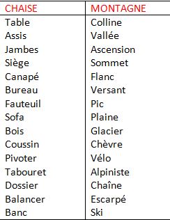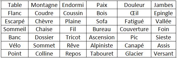 Distrayez-le à nouveau par une tâche distractrice (en lui demandant de continuer à compter à l’envers depuis le nombre où il s’est arrêté précédemment, poussons le vice jusqu’au bout). Enfin, dites-lui que vous allez à nouveau lui dicter plusieurs mots (liste ci-dessous) et que, pour chacun, il faudra qu’il vous dise si oui ou non, il a entendu ces mots au début de l’exercice. N’oubliez pas de noter les mots que votre sujet pense avoir entendu ou bien de les cocher dans le tableau.