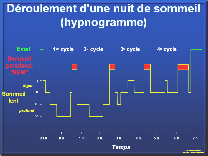 Une nuit de sommeil dit « normal » est composée de plusieurs cycles de 4 phases chacun (classification de Kleitman, 1969) :
