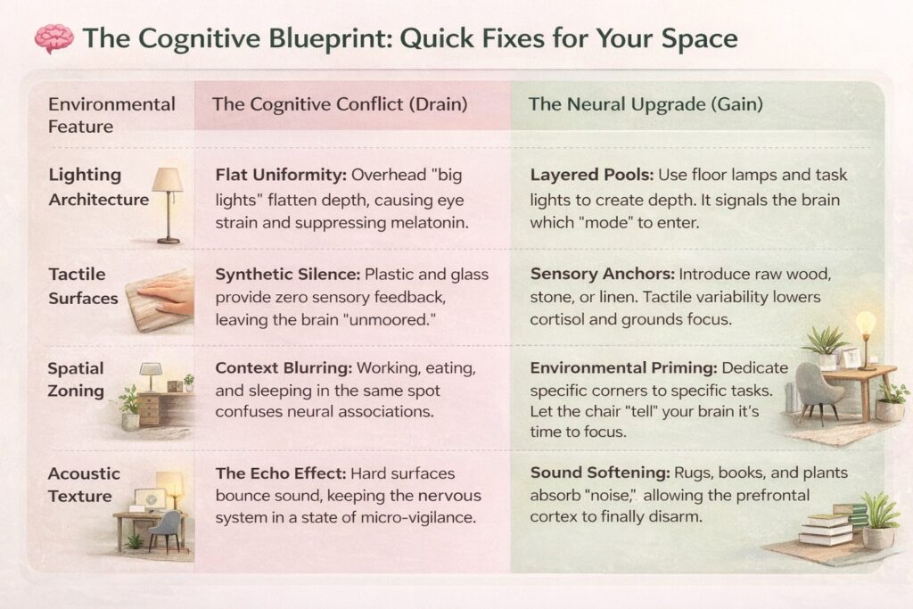 A well-designed environment does not make you smarter, but it makes thinking easier. When your space reduces background cognitive noise, your brain spends less energy filtering distractions and more energy doing the work you actually care about.